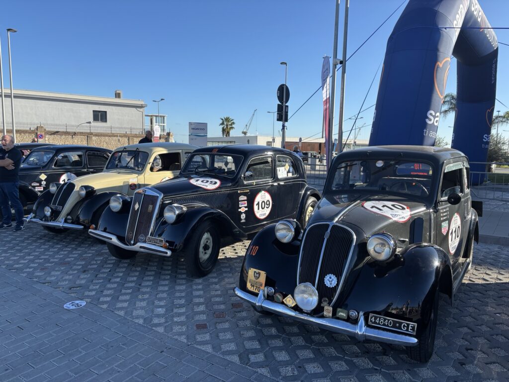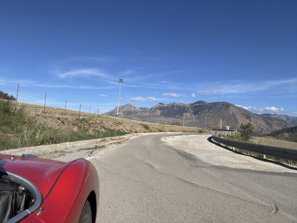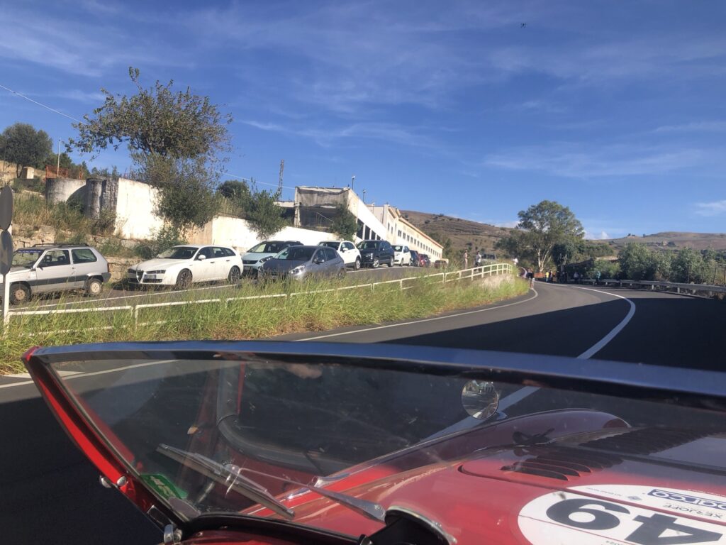 Mein Tageszusammenfassung ist heute zwiespältig. Toller sonniger Tag und beeindruckende, wechselnde Landschaft von Meer bis Gebirge mit viiiiielen Kurven. Auch heute galt, das Verkehrsregeln nur zum „Nicht Einhalten“ da sind. Absolut verrückt. Die Leute an der Strecke begeistert mit Daumen hoch und Foto-Orgien im Vorbeifahren. Peter ist sehr gut und sicher gefahren. Allerdings musste der Healey mit seinen 70 Jahren viel ertragen – Bodenwellen gegen die Sonne und folgenden Schatten teilweise schwer bis nicht zu sehen, Schlaglöcher ohne Ende. Auf der ehemaligen Targa Florio Rennstrecke waren häufig halbe Straßenasphaltstücke der halben Straße komplett weggebrochen. Anstatt Oldtimern wäre hier der deutsche „Schul-SUV“ besser im Einsatz gewesen! Ein Landrover hätte auch Spaß gehabt. Wir haben die Rallye durchgezogen. Meine Navigatortätigkeit als Copilot war weniger zufriedenstellend. Teilweise waren durch die Sonne die Starttasten der vorprogrammierten Zeiten nicht auf dem iPhone zu sehen, durch besagte Bodenunebenheiten ist man auf falsche Tasten gekommen, das Bordbuch ist häufig zur Seite gerutscht, da sich Festhalten angesagt war. Alles in allem schwierig und schwer beim unruhigen Fahren zu Händeln. Insgesamt nur etwas für Verrückte!, die das un-kalkulierte Risiko mögen und gerne nach 9 Stunden Konzentration müde und verschwitzt aus dem Roadster steigen.